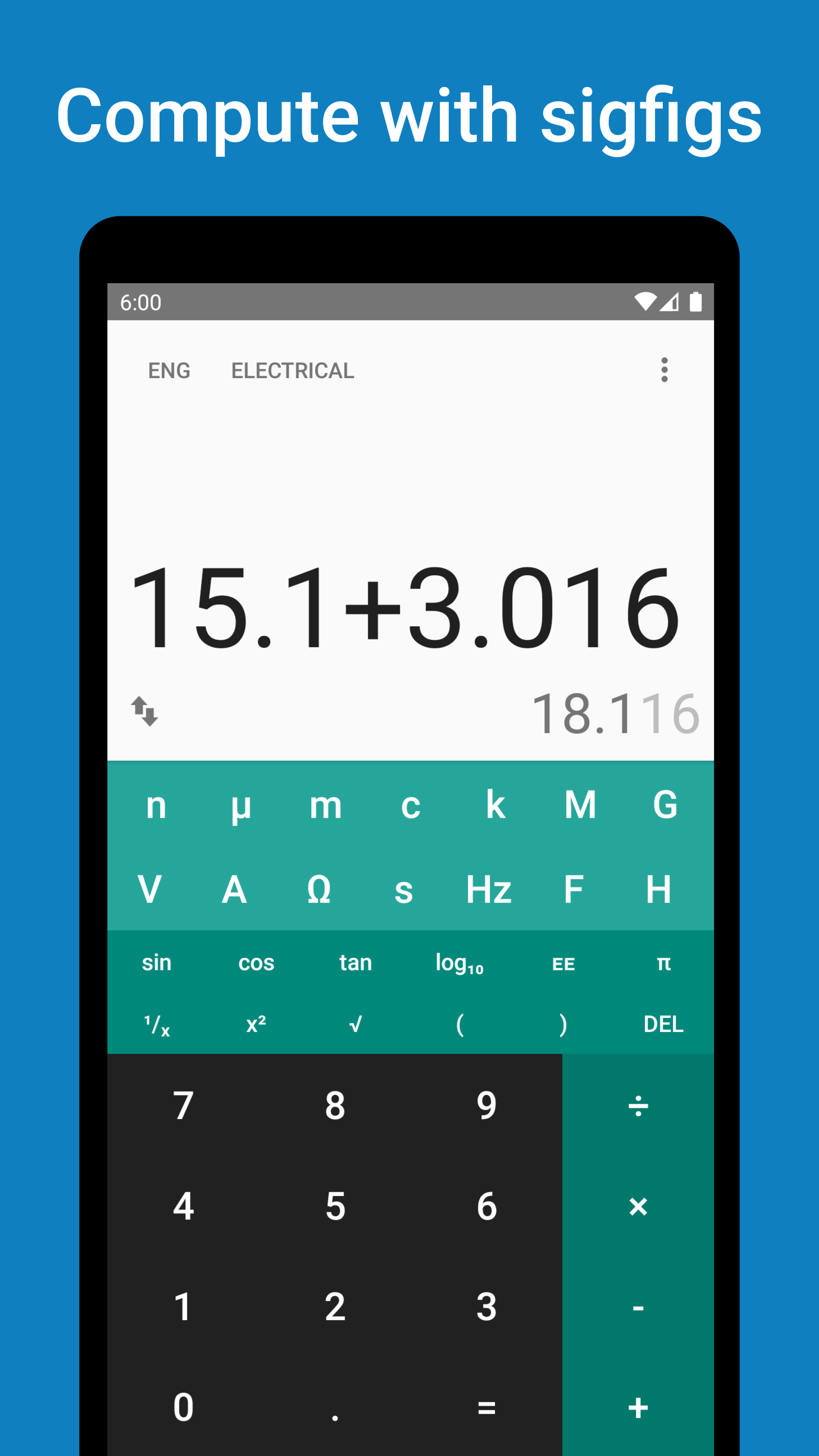 Digits is an android app designed to make engineering and scientific calculations easier. It was born out of my own need to perform calculations with units of different magnitude. Users may upgrade to a “pro” mode if they would like access to a larger variety of skins. Parsing is done over a unicode string, so the user may copy/paste expressions if they wish.